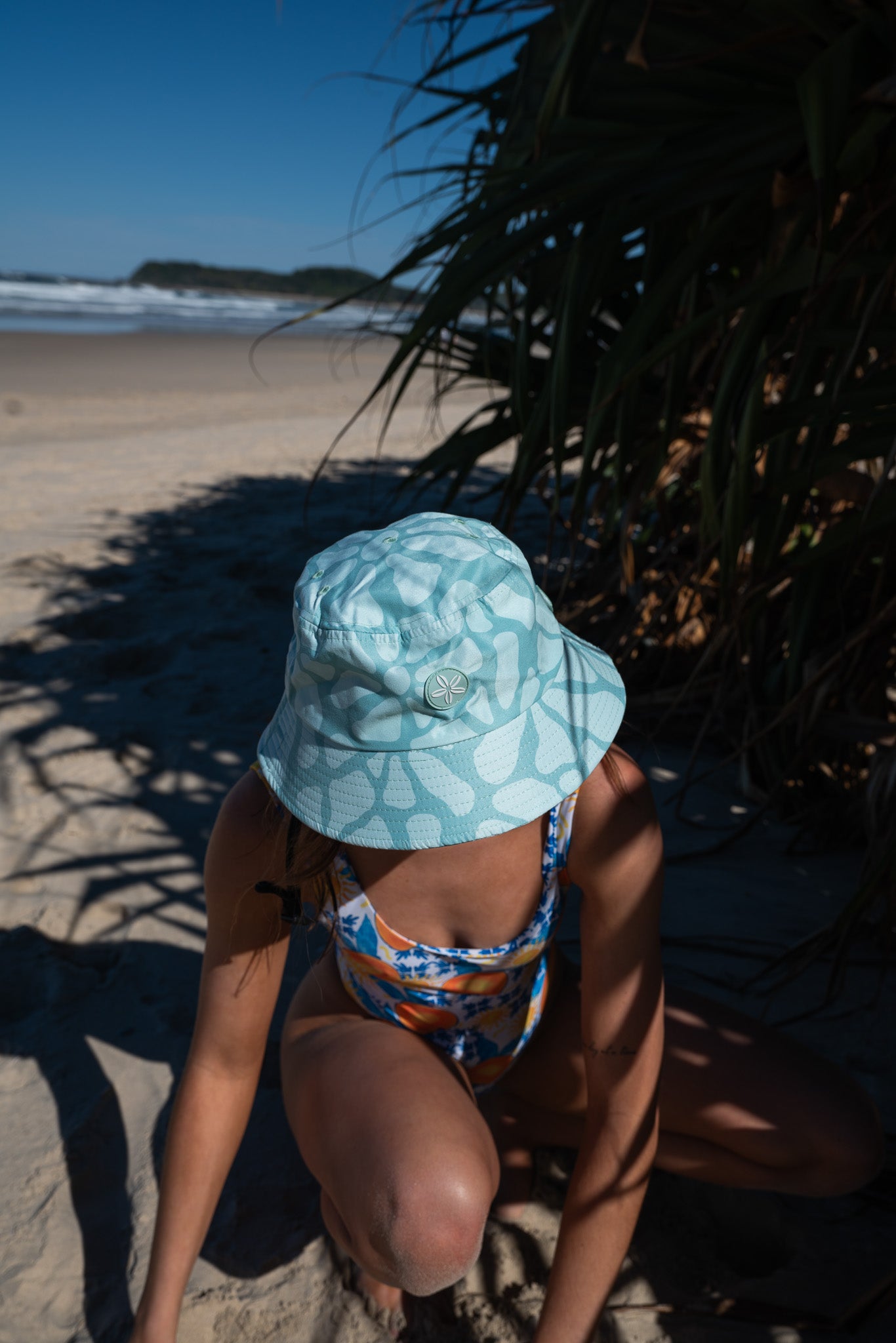 Our Lazy Daisies surf hat features a two-toned blue/green floral pattern. Designed for both functionality and flair, this hat combines a vibrant floral pattern with the practicality you need for your outdoor adventures.